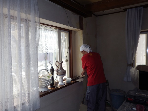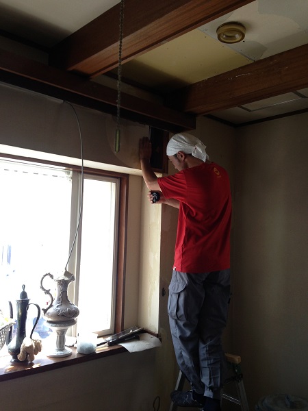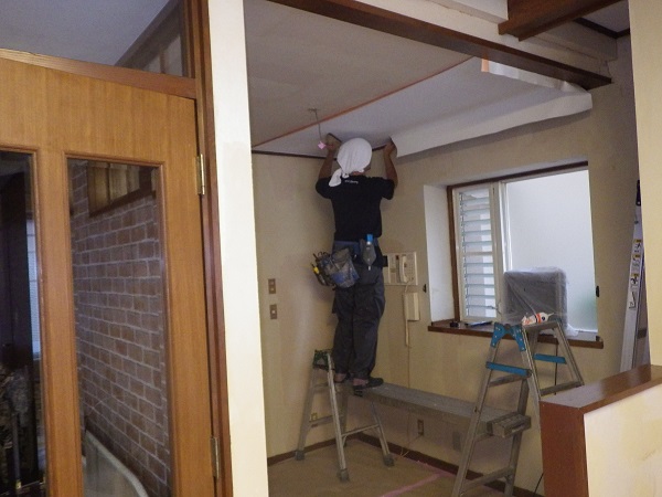 職人さんの頭の上が新たに貼り替えた石膏ボードです。