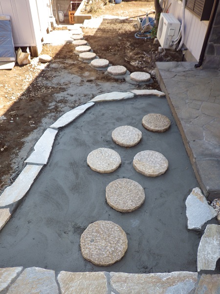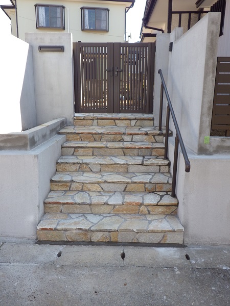 HOME 工事日誌 外構工事 階段部 石貼り完了 外構工事 階段部 石貼り完了 門扉への階段部分は乱形の石材をランダムに貼っていただき、 やつと完了いたしました。手摺りも取付ていただいました。 ブロック積みされたモルタル部分は、リシンで吹付け塗装致します。 手摺は、門扉・フェンスと同色のオータムブラウンにして、落ち着いた雰囲気に 仕上がりました。 門扉を開くと、玄関ドアへのアプローチとして、飛び石を敷いて歩けるようにしました。 奥のほうに敷いてある飛び石は、車庫からのアプローチ用です。 飛び石の回りには、砂利を敷き詰める予定です。 船橋店:中山