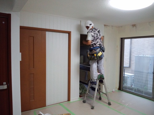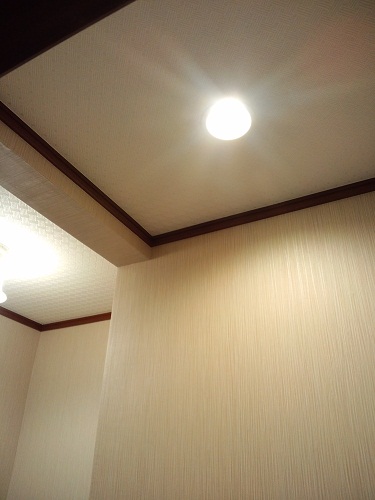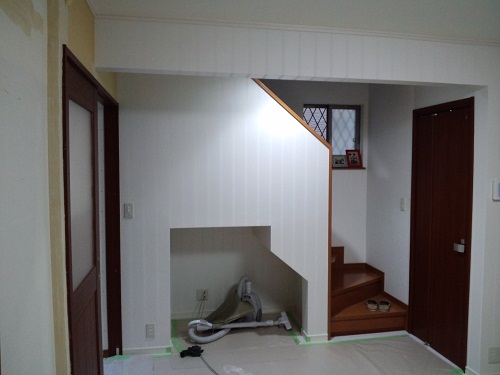 HOME 工事日誌 戸建1階改装 クロス施工&照明取付 船橋市 戸建1階改装 クロス施工&照明取付 船橋市 先日からの続きで、新リビングダイニングの壁クロス貼り替え中です。 クロスは多少グリーンががったホワイト系で縦ラインを意識した織物調の柄です。 階段下のスペースにはTVを置かれることもあり、 その手前の天井には、省電力で明るいLEDのダウンライトを取付ていただきました。 新トイレ内部の手洗い器側にもLEDのダウンライトを取付ました。 船橋店:中山