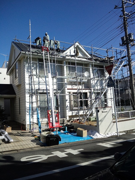 足場を掛けた後、LIXIL製太陽光発電システム「ソーラーラック」の取付を