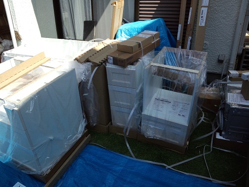 まずは搬入・・・庭にブルーシートを敷いて、大量の箱を置いて一つずつ開封していきます。