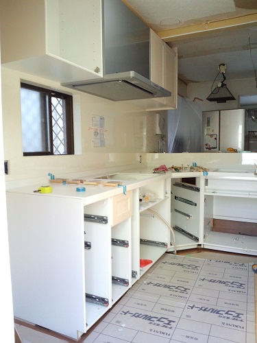 レンジフードと吊戸棚の取付が終わってから、下台の組立設置です。
